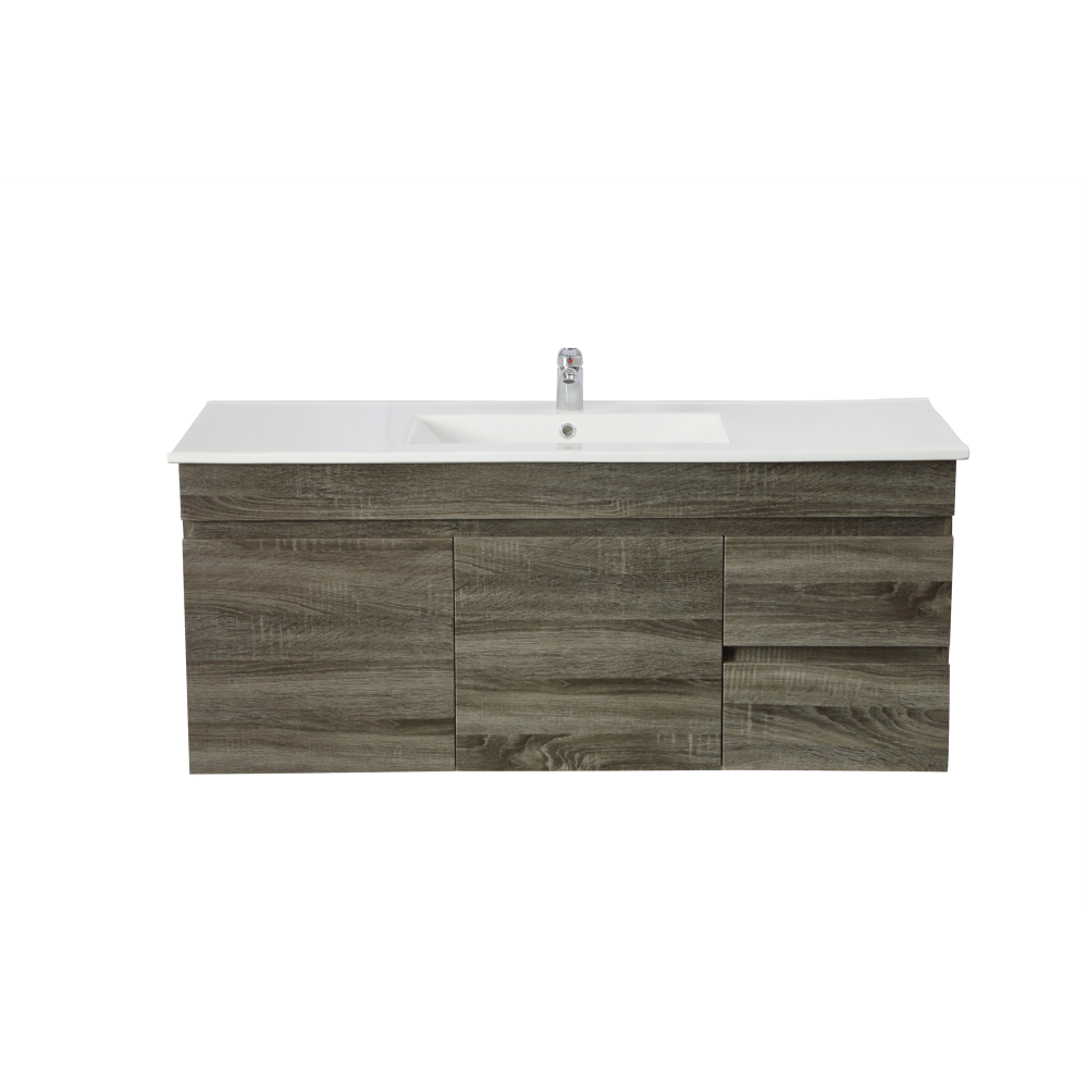 “DARK GREY WOOD GRAIN PVC VACUUM FILMED MDF BOARD PRODUCT CODE: B124RL-DG FLOOR STANDARD SIZE VANITY CABINET ONLY RIGHT SOFT CLOSING DOUBLE DRAWERS TWO SOFT CLOSING DOOR OPTIONAL TOPS: -CERAMIC TOP OR POLY TOP -STONE TOP (AVAILABLE FOR UNDERMOUNT BASIN OR ABOVE BASIN)