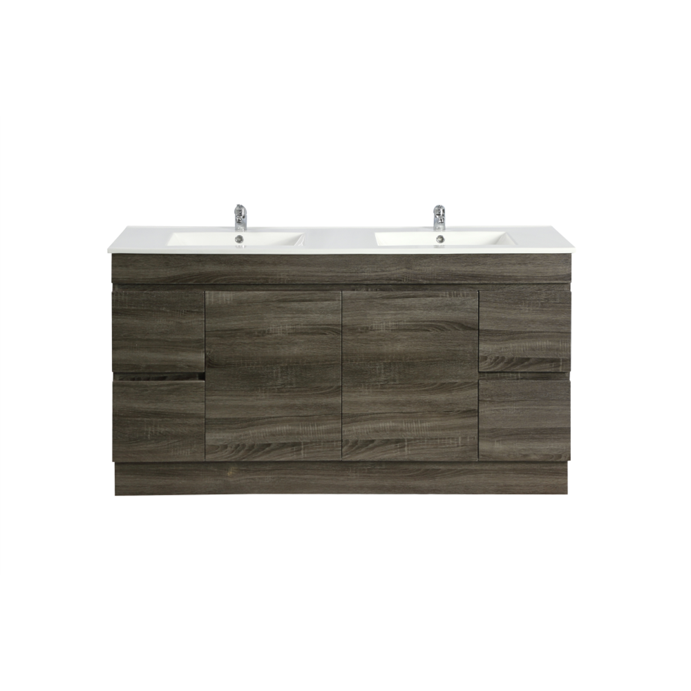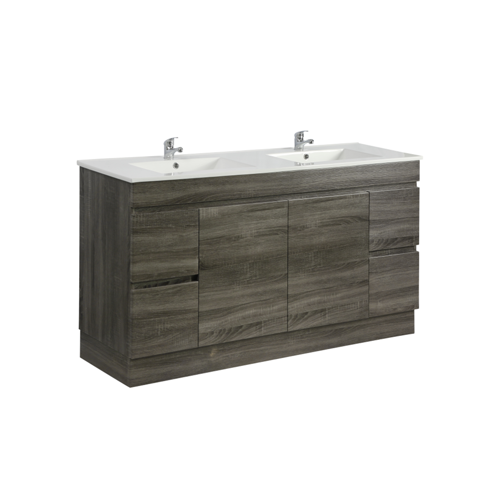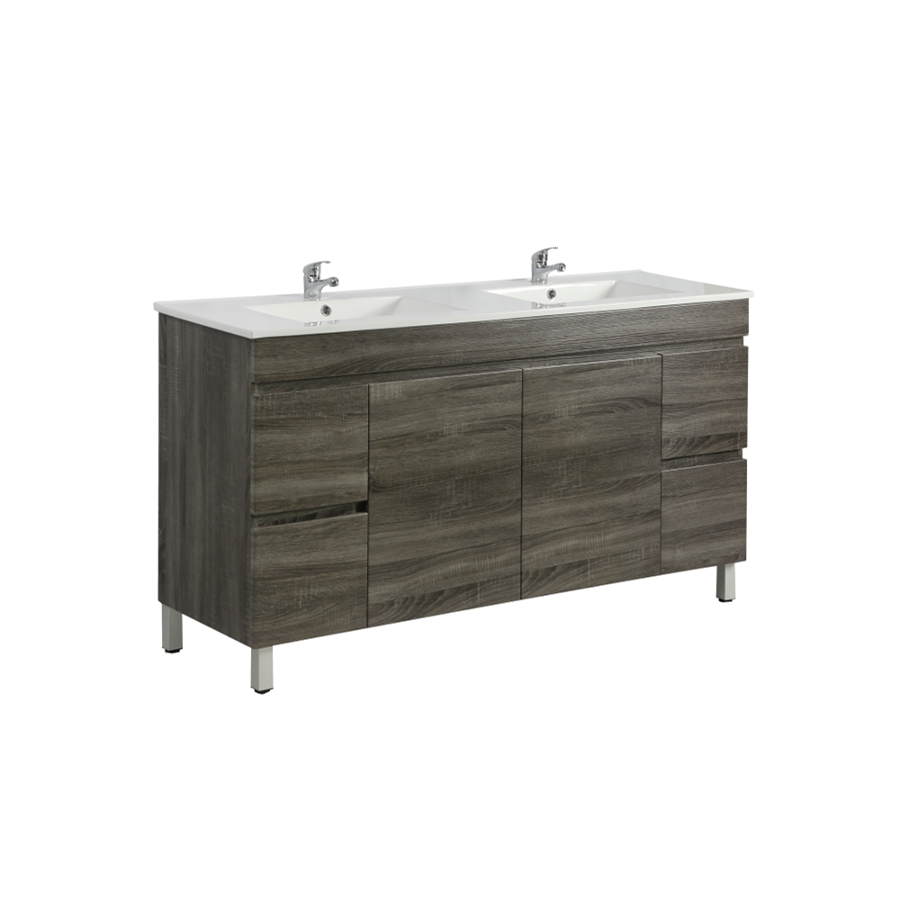 “WHITE OAK WOOD GRAIN PVC VACUUM FILMED MDF BOARD PRODUCT CODE: B154L-WO WALL HUNG STANDARD SIZE VANITY CABINET ONLY FOUR SOFT CLOSING DRAWERS DOUBLE SOFT CLOSING DOORS OPTIONAL TOPS: -CERAMIC TOP OR POLY TOP -STONE TOP (AVAILABLE FOR UNDERMOUNT BASIN OR ABOVE BASIN)
