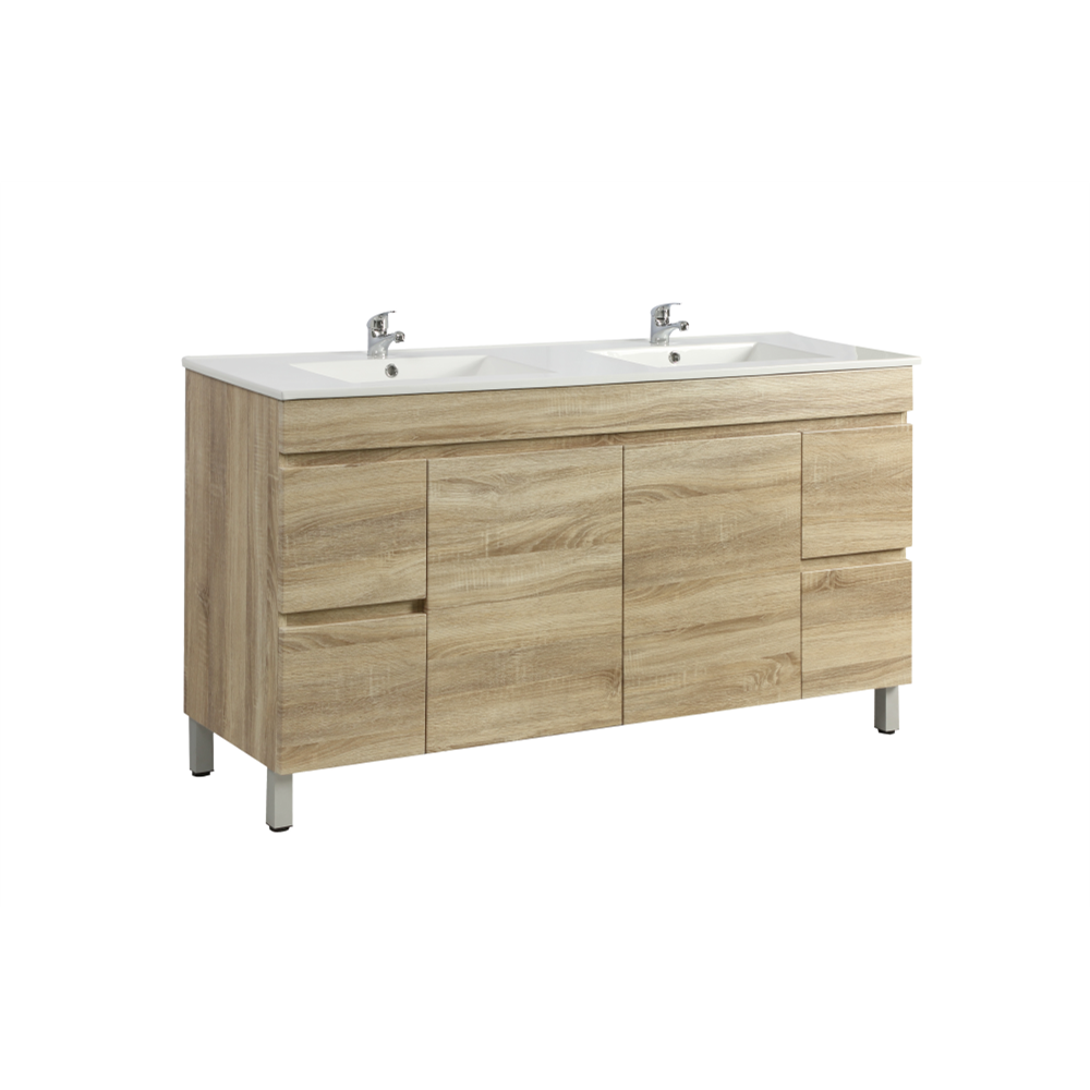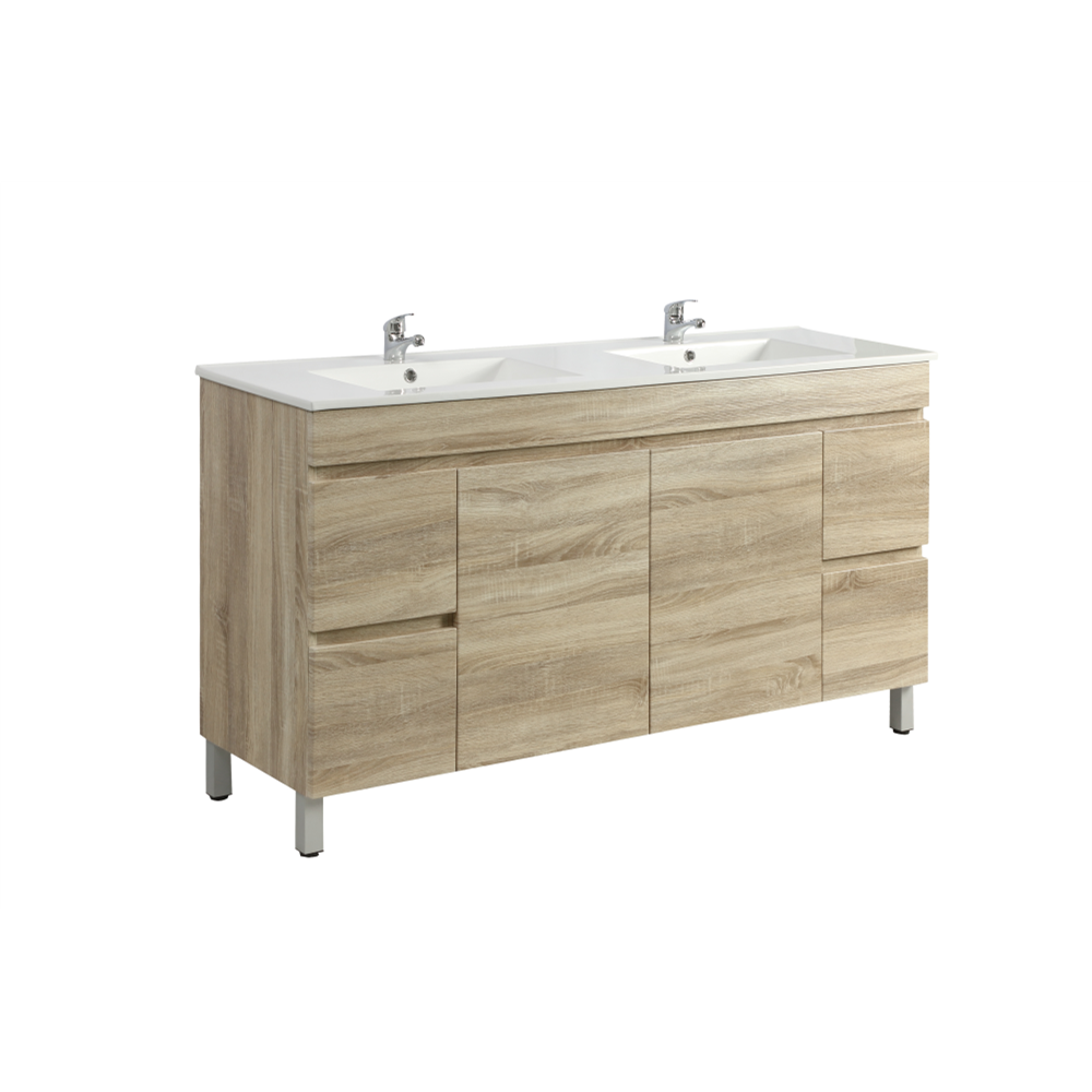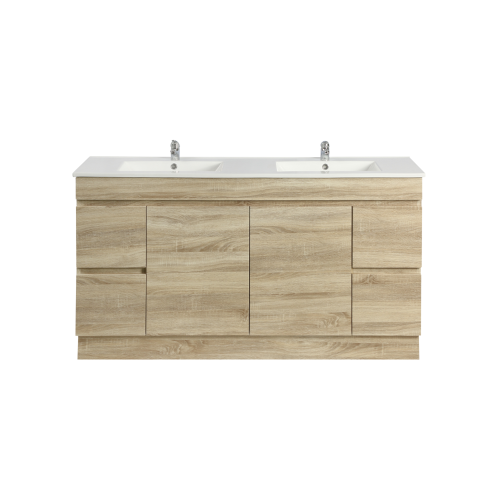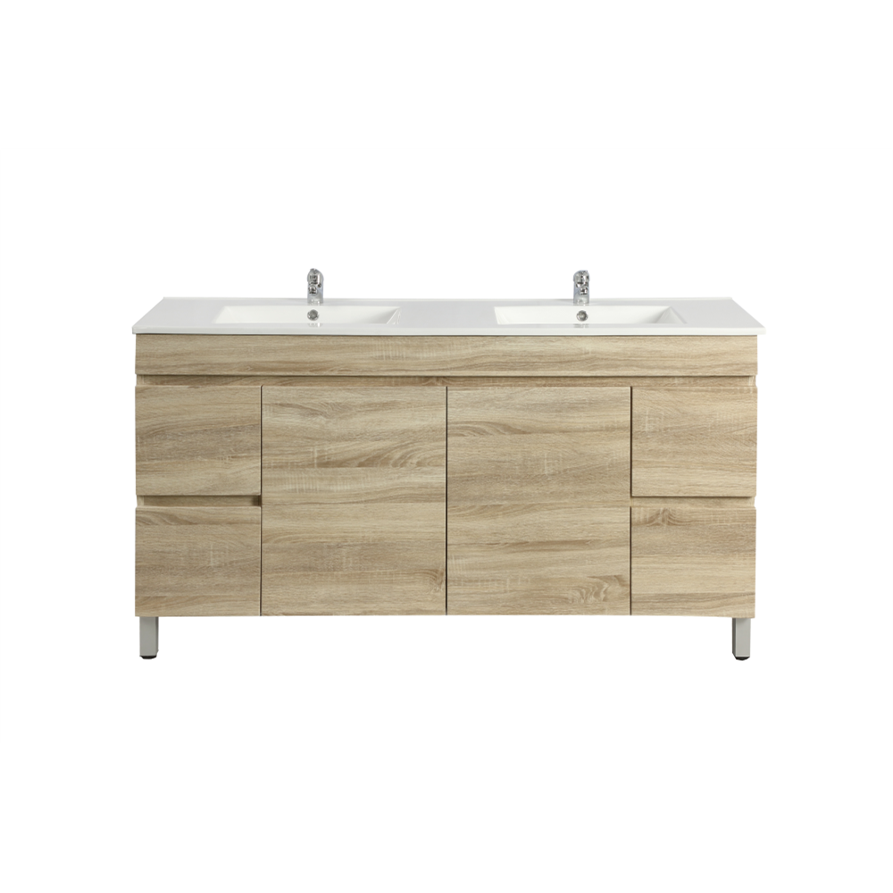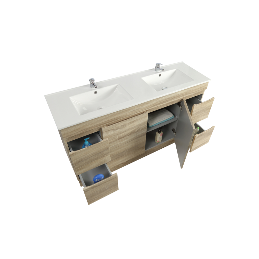 “WHITE OAK WOOD GRAIN PVC VACUUM FILMED MDF BOARD PRODUCT CODE: B154L-WO WALL HUNG STANDARD SIZE VANITY CABINET ONLY FOUR SOFT CLOSING DRAWERS DOUBLE SOFT CLOSING DOORS OPTIONAL TOPS: -CERAMIC TOP OR POLY TOP -STONE TOP (AVAILABLE FOR UNDERMOUNT BASIN OR ABOVE BASIN)