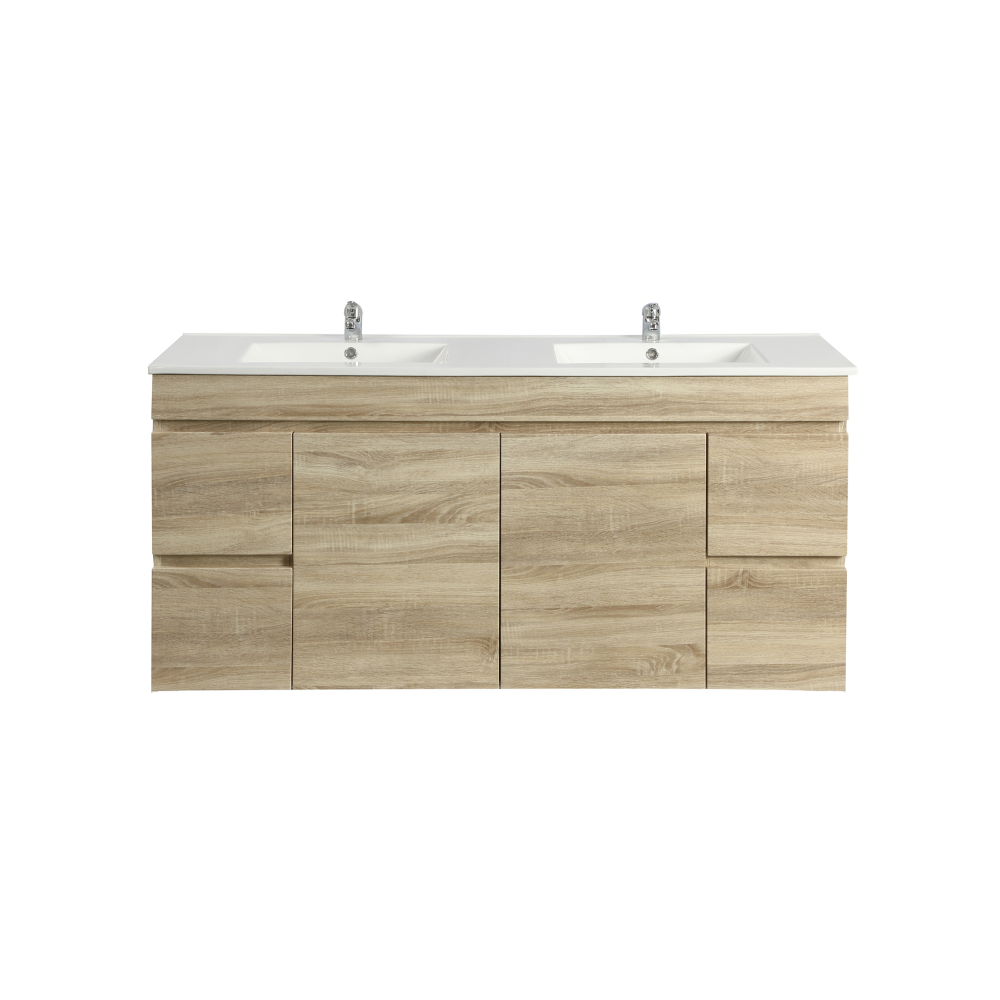 “WHITE OAK WOOD GRAIN PVC VACUUM FILMED MDF BOARD PRODUCT CODE: B154W-WO WALL HUNG STANDARD SIZE VANITY CABINET ONLY FOUR SOFT CLOSING DRAWERS DOUBLE SOFT CLOSING DOORS OPTIONAL TOPS: -CERAMIC TOP OR POLY TOP -STONE TOP (AVAILABLE FOR UNDERMOUNT BASIN OR ABOVE BASIN)