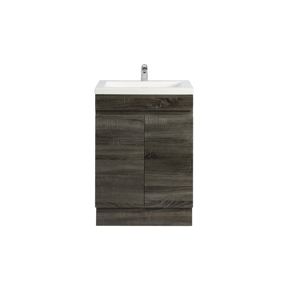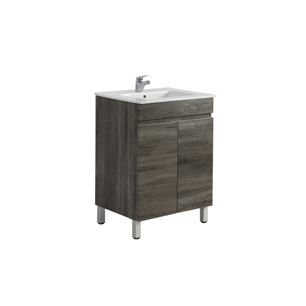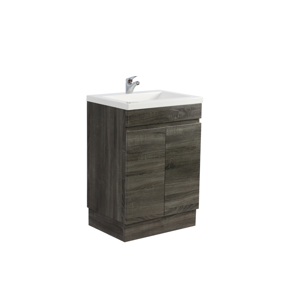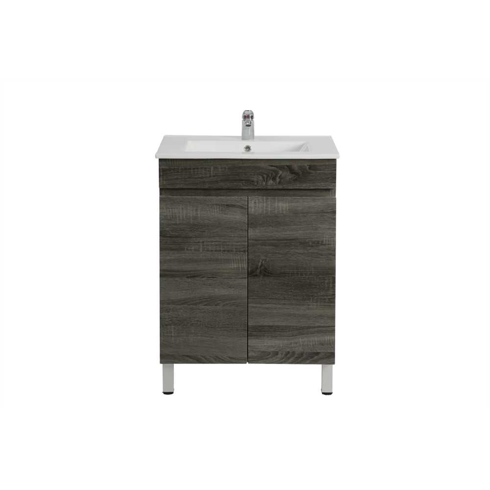 “DARK GREY WOOD GRAIN PVC VACUUM FILMED MDF BOARD PRODUCT CODE: B64L-DG FLOOR STANDARD SIZE VANITY CABINET ONLY SOFT CLOSING DOUBLE DOORS OPTIONAL TOPS: -CERAMIC TOP OR POLY TOP -STONE TOP (AVAILABLE FOR UNDERMOUNT BASIN OR ABOVE BASIN)