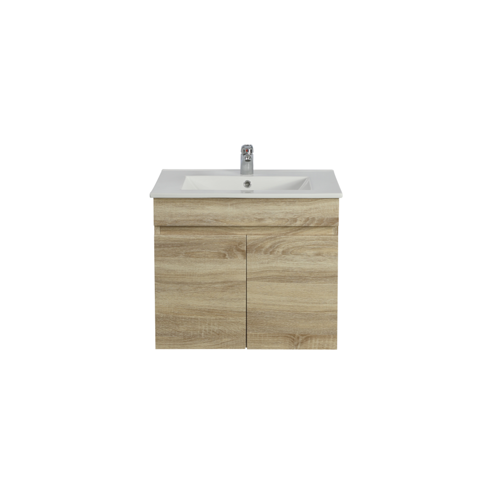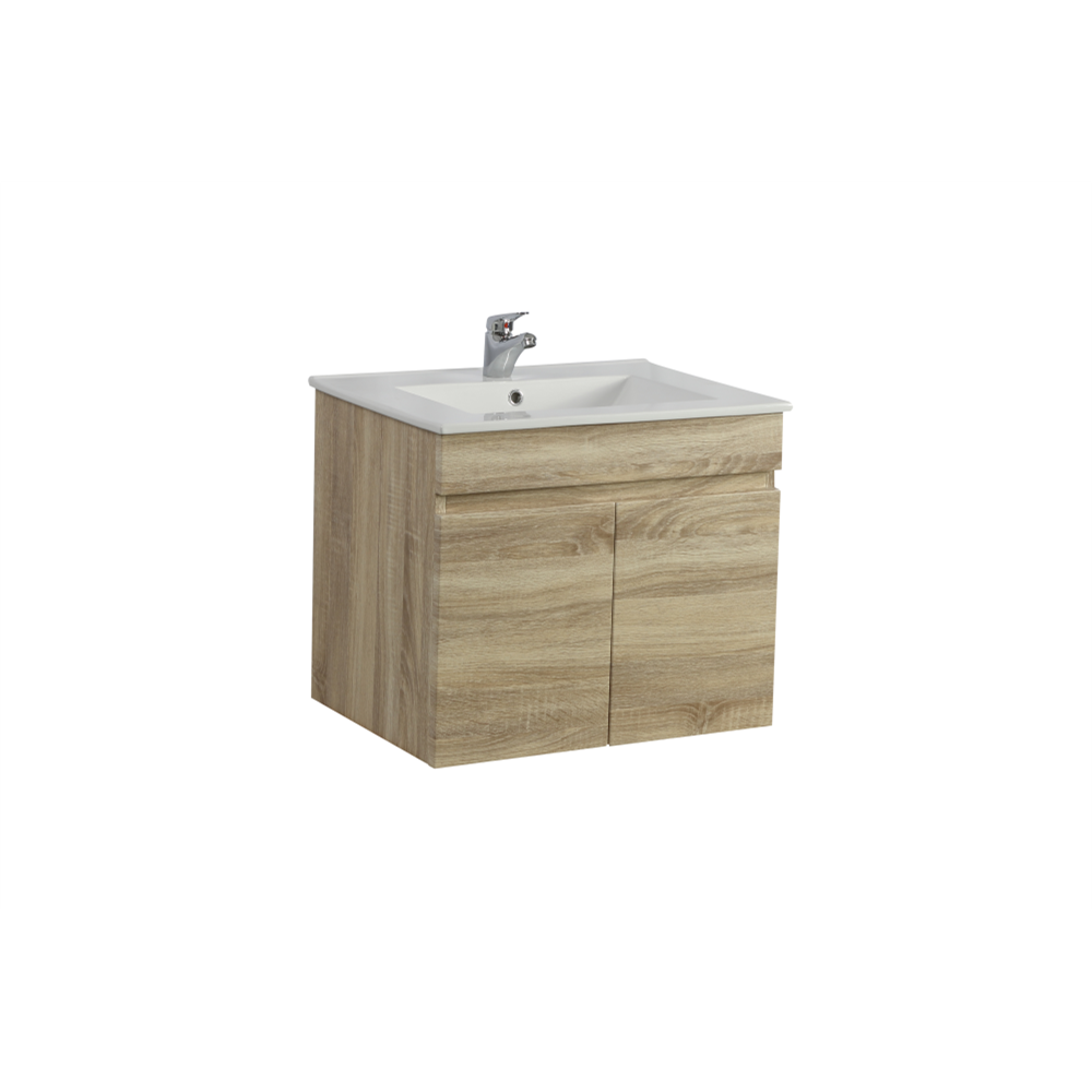 “WHITE OAK WOOD GRAIN PVC VACUUM FILMED MDF BOARD PRODUCT CODE: B64W-WO WALL HUNG STANDARD SIZE VANITY CABINET ONLY SOFT CLOSING DOUBLE DOORS OPTIONAL TOPS: -CERAMIC TOP OR POLY TOP -STONE TOP (AVAILABLE FOR UNDERMOUNT BASIN OR ABOVE BASIN)
