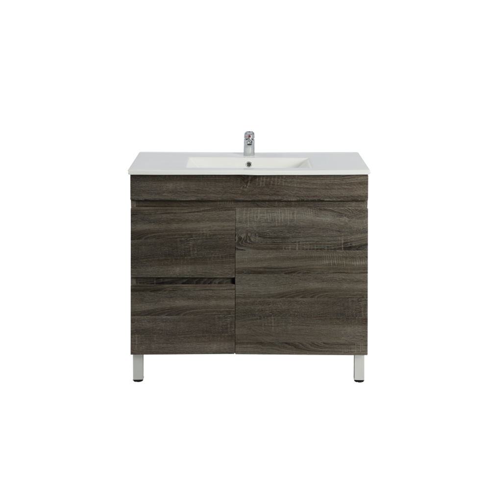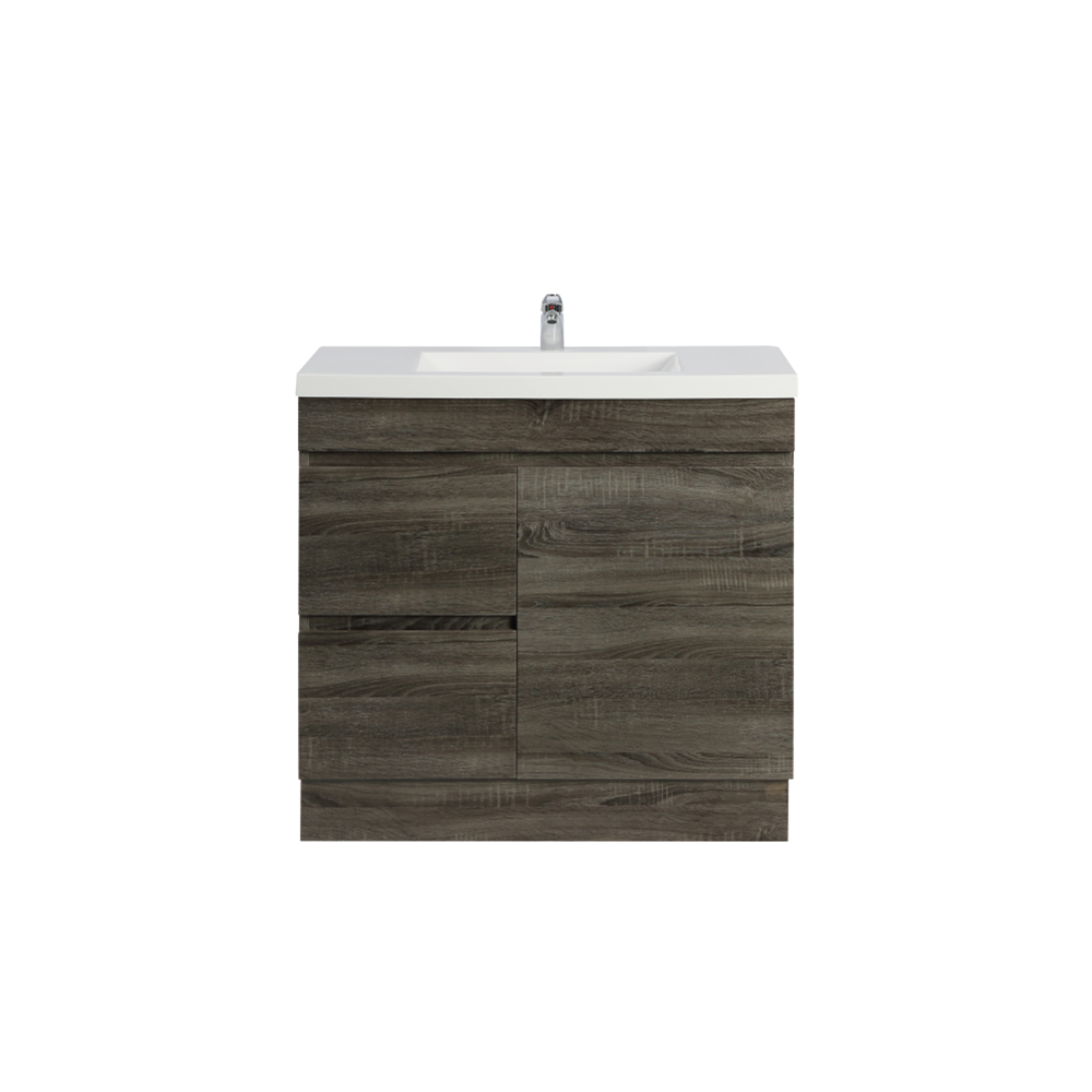 “DARK GREY WOOD GRAIN PVC VACUUM FILMED MDF BOARD PRODUCT CODE: B74LL-DG FLOOR STANDARD SIZE VANITY CABINET ONLY LEFT SOFT CLOSING DOUBLE DRAWERS ONE SOFT CLOSING DOOR OPTIONAL TOPS: -CERAMIC TOP OR POLY TOP -STONE TOP (AVAILABLE FOR UNDERMOUNT BASIN OR ABOVE BASIN)