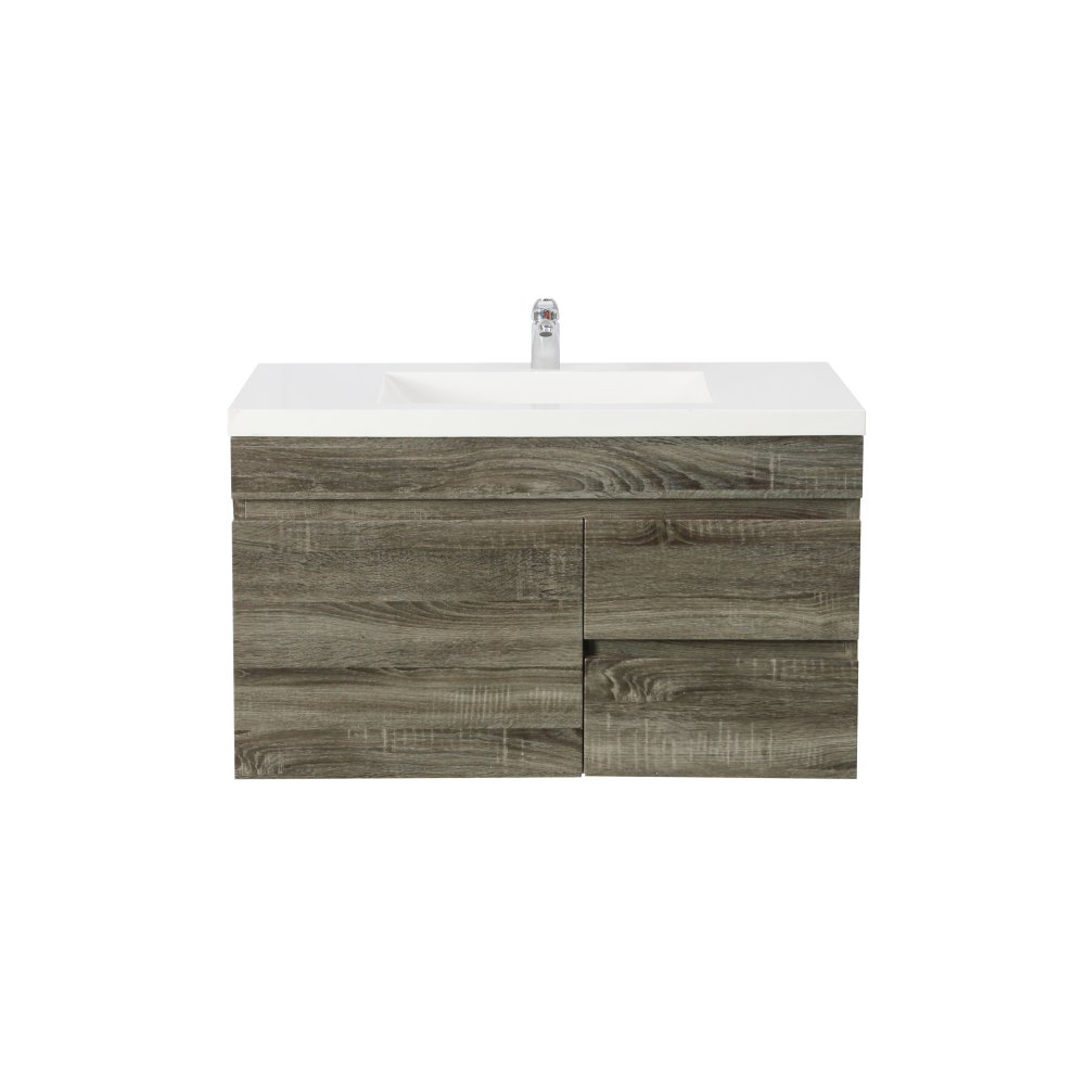 “DARK GREY WOOD GRAIN PVC VACUUM FILMED MDF BOARD PRODUCT CODE: B74RW-DG WALL HUNG STANDARD SIZE VANITY CABINET ONLY RIGHT SOFT CLOSING DOUBLE DRAWERS ONE SOFT CLOSING DOOR OPTIONAL TOPS: -CERAMIC TOP OR POLY TOP -STONE TOP (AVAILABLE FOR UNDERMOUNT BASIN OR ABOVE BASIN)
