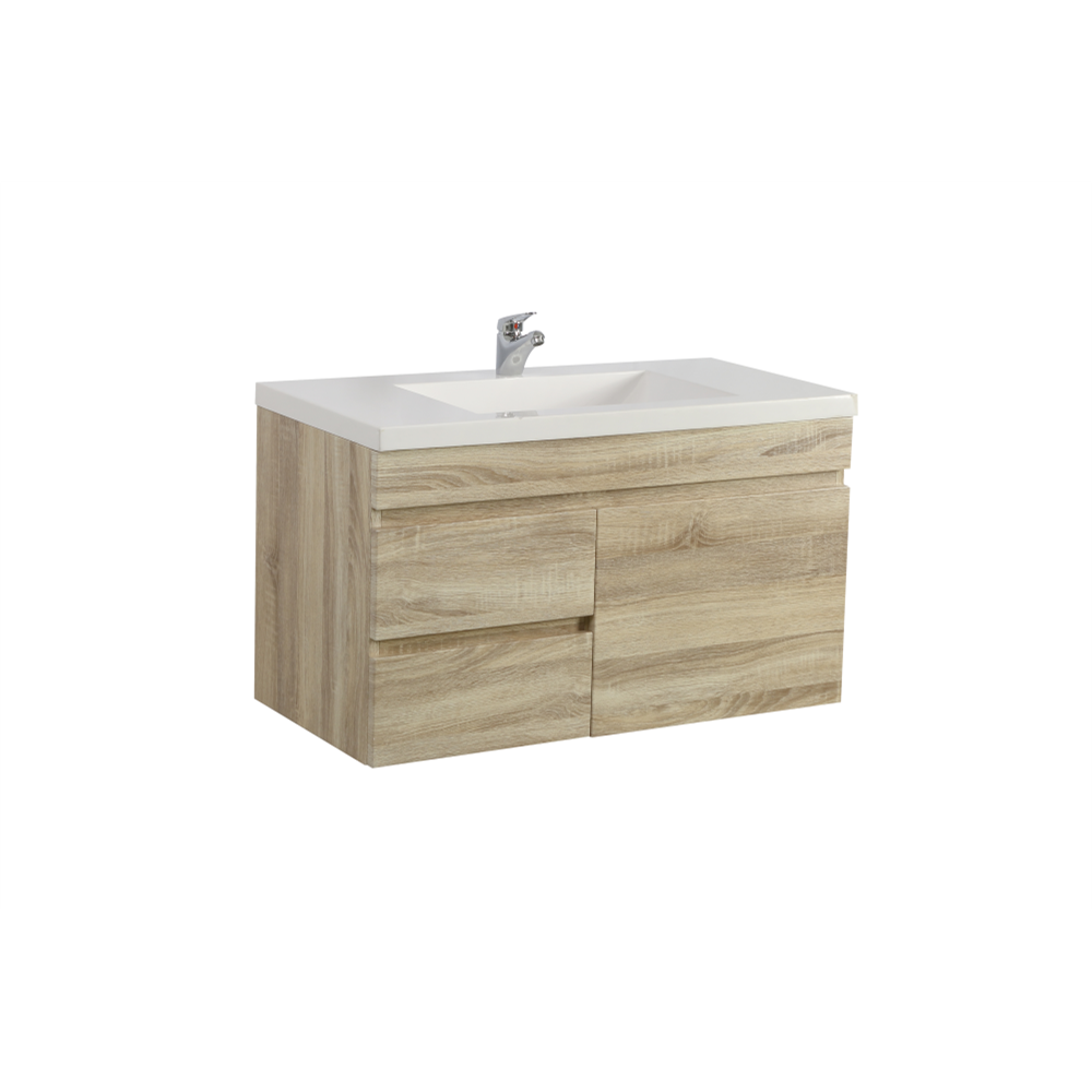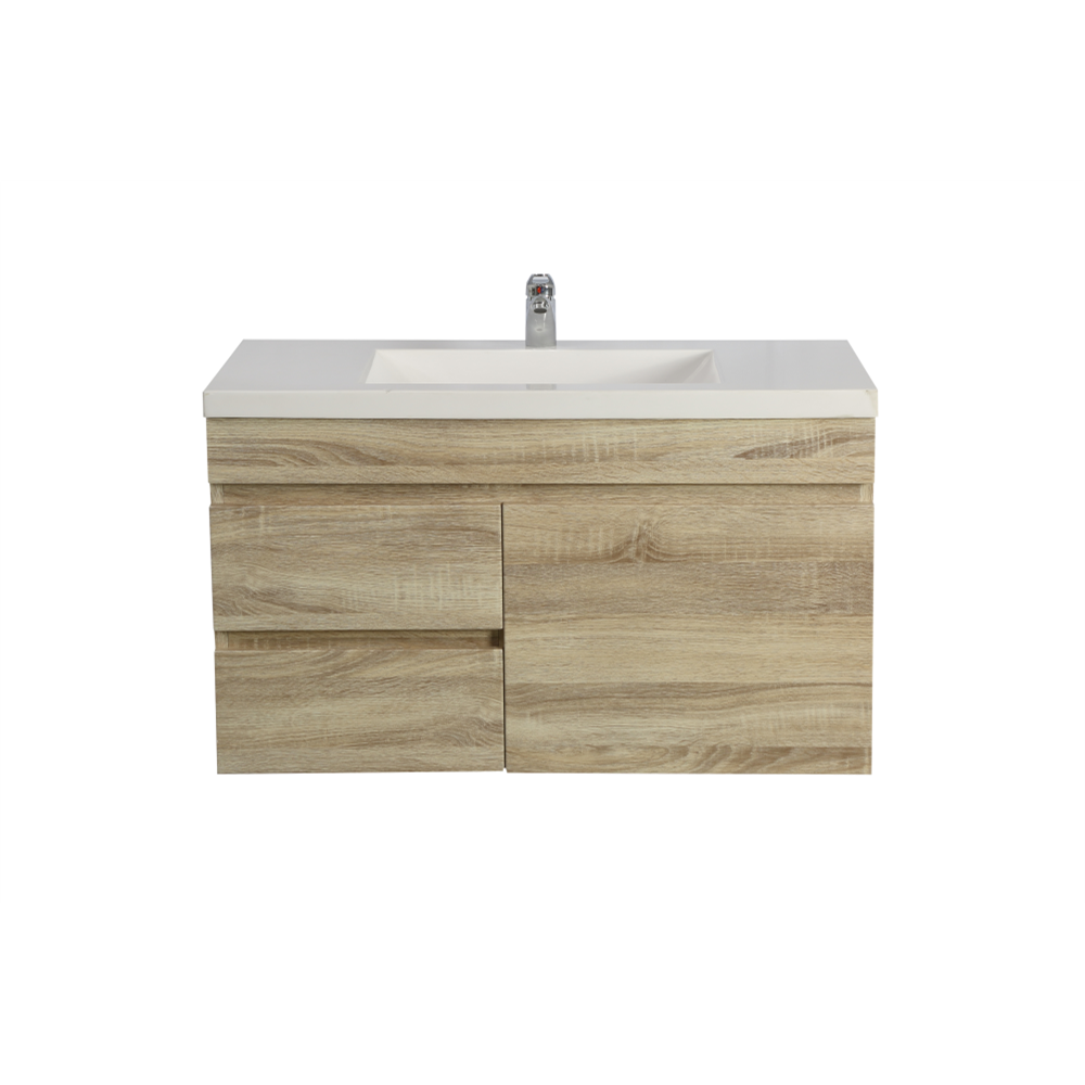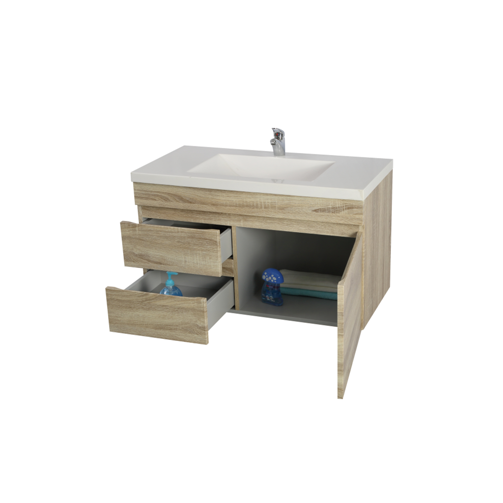 “WHITE OAK WOOD GRAIN PVC VACUUM FILMED MDF BOARD PRODUCT CODE: B94LW-WO WALL HUNG STANDARD SIZE VANITY CABINET ONLY LEFT SOFT CLOSING DOUBLE DRAWERS ONE SOFT CLOSING DOOR OPTIONAL TOPS: -CERAMIC TOP OR POLY TOP -STONE TOP (AVAILABLE FOR UNDERMOUNT BASIN OR ABOVE BASIN)