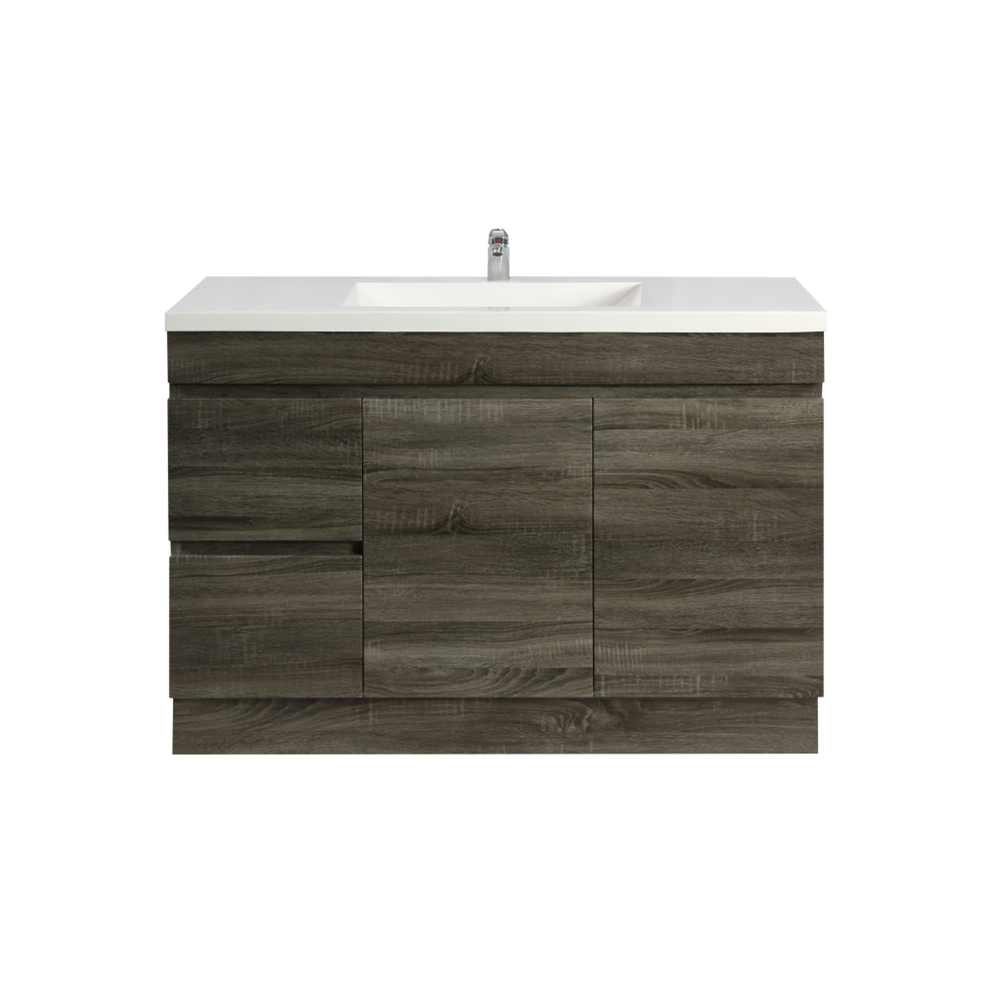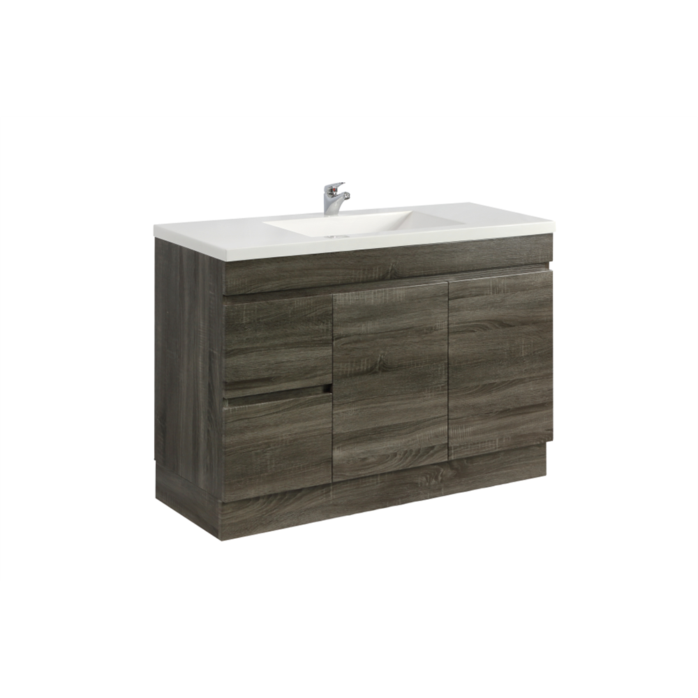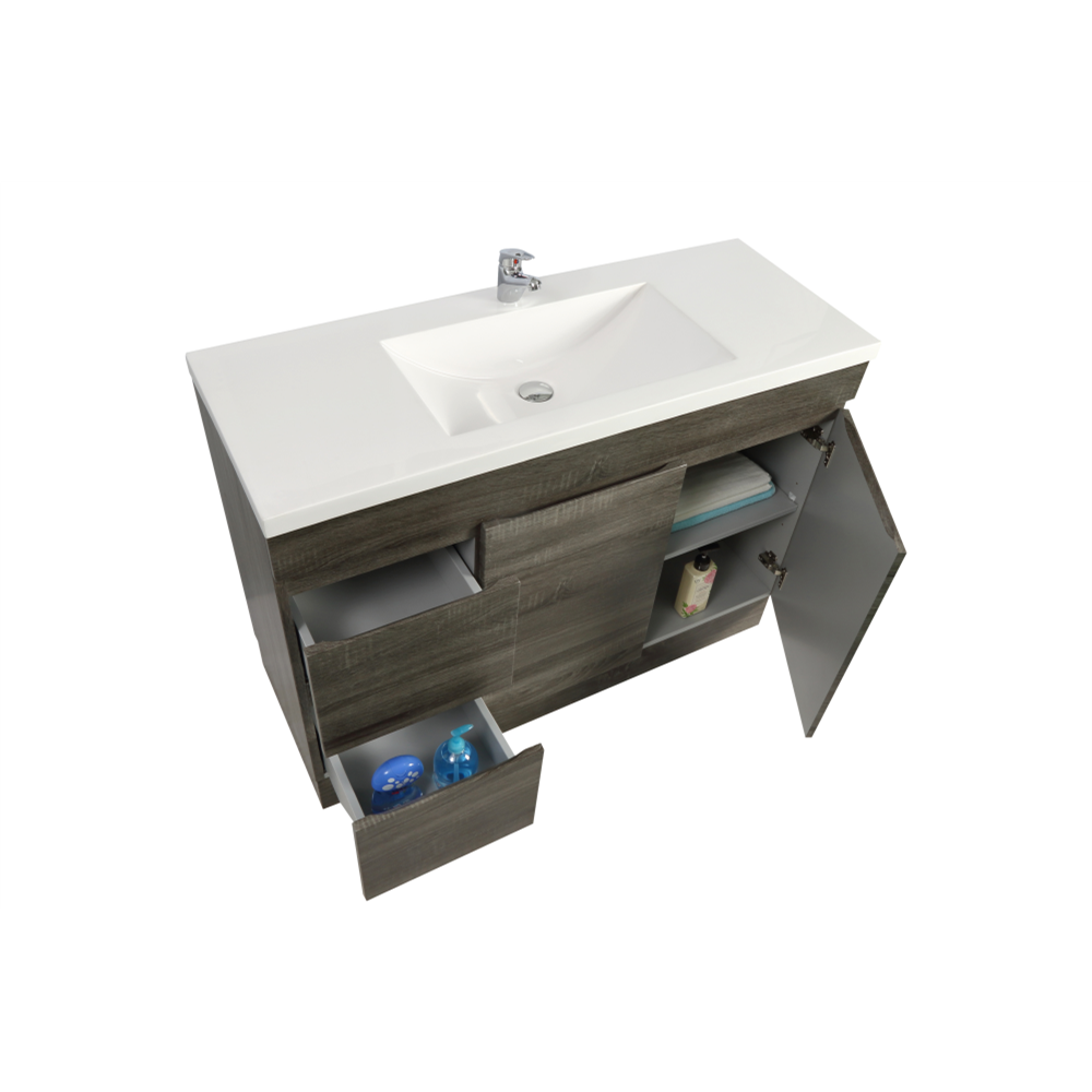 “WHITE OAK WOOD GRAIN PVC VACUUM FILMED MDF BOARD PRODUCT CODE: B124LL-WO FLOOR STANDARD SIZE VANITY CABINET ONLY LEFT SOFT CLOSING DOUBLE DRAWERS TWO SOFT CLOSING DOOR OPTIONAL TOPS: -CERAMIC TOP OR POLY TOP -STONE TOP (AVAILABLE FOR UNDERMOUNT BASIN OR ABOVE BASIN)