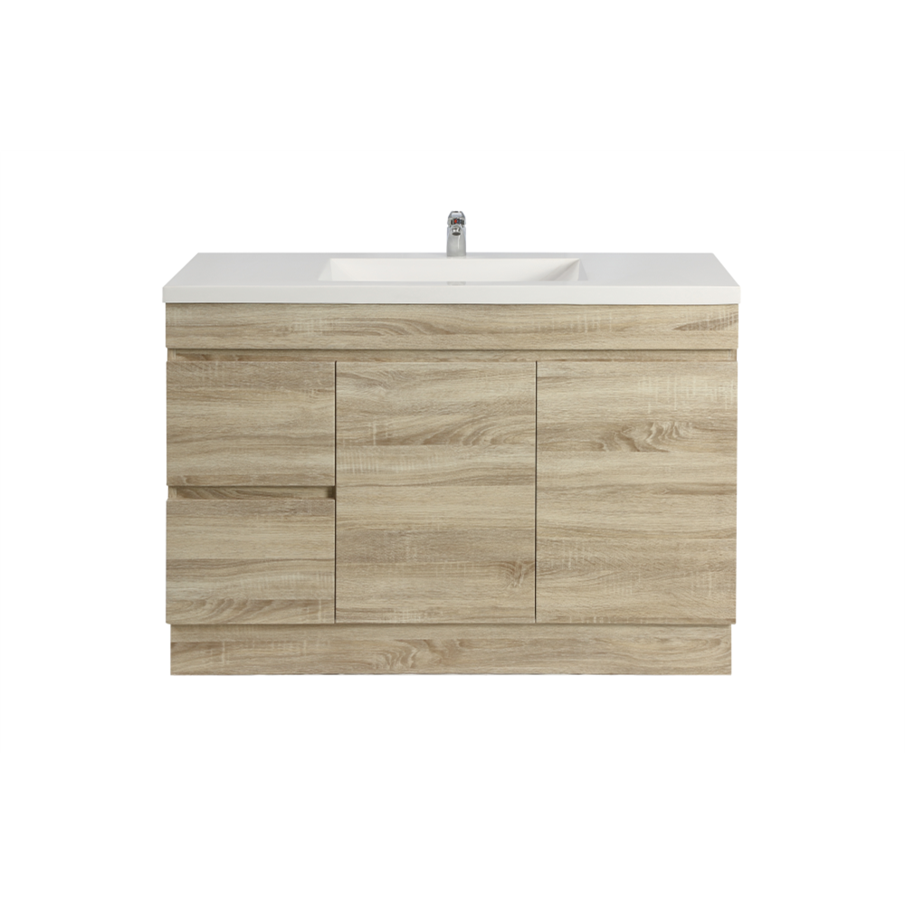 “WHITE OAK WOOD GRAIN PVC VACUUM FILMED MDF BOARD PRODUCT CODE: B124LL-WO FLOOR STANDARD SIZE VANITY CABINET ONLY LEFT SOFT CLOSING DOUBLE DRAWERS TWO SOFT CLOSING DOOR OPTIONAL TOPS: -CERAMIC TOP OR POLY TOP -STONE TOP (AVAILABLE FOR UNDERMOUNT BASIN OR ABOVE BASIN)