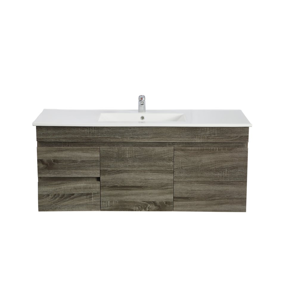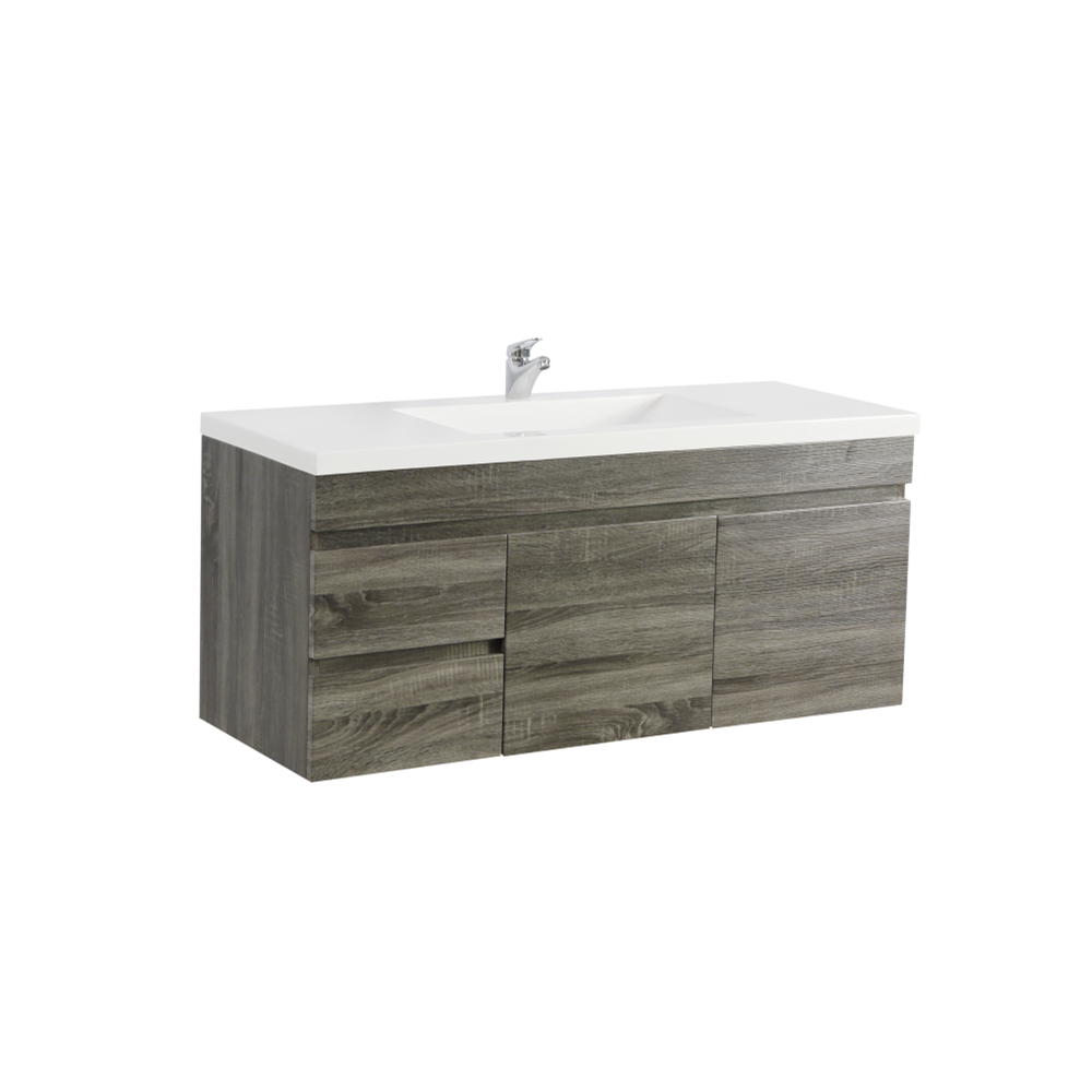 “DARK GREY WOOD GRAIN PVC VACUUM FILMED MDF BOARD PRODUCT CODE: B124LL-DG FLOOR STANDARD SIZE VANITY CABINET ONLY LEFT SOFT CLOSING DOUBLE DRAWERS TWO SOFT CLOSING DOOR OPTIONAL TOPS: -CERAMIC TOP OR POLY TOP -STONE TOP (AVAILABLE FOR UNDERMOUNT BASIN OR ABOVE BASIN)